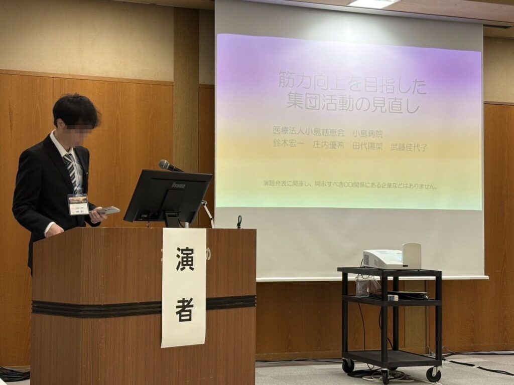 作業療法室は、石川県立こころの病院での見学をもとに、作業療法への興味を引き出すための工夫や、小グループでの介入によって筋力向上が得られたケースについて発表しました。