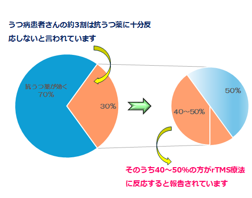 うつ病患者さんの約3割は抗うつ薬治療に反応しないと言われており、最近のrTMS療法の治療情報を収集したデータベースを用いた研究では、そのうちの40~50%がrTMS療法に反応しています。(日本精神神経学会・反復経頭蓋磁気刺激装置適正使用指針より抜粋)
